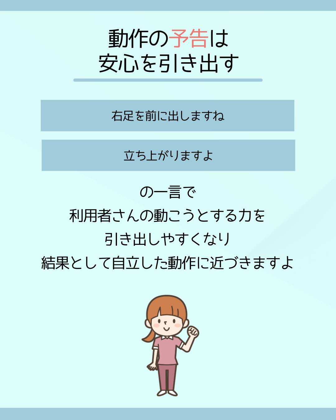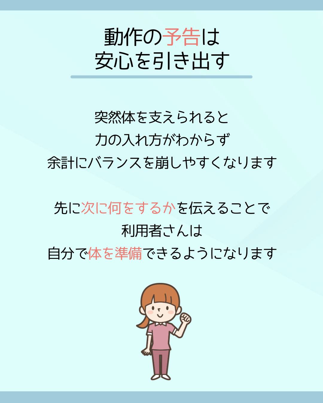 先に「次に何をするか」を伝えることで、利用者さんは自分で体を準備できるようになります。