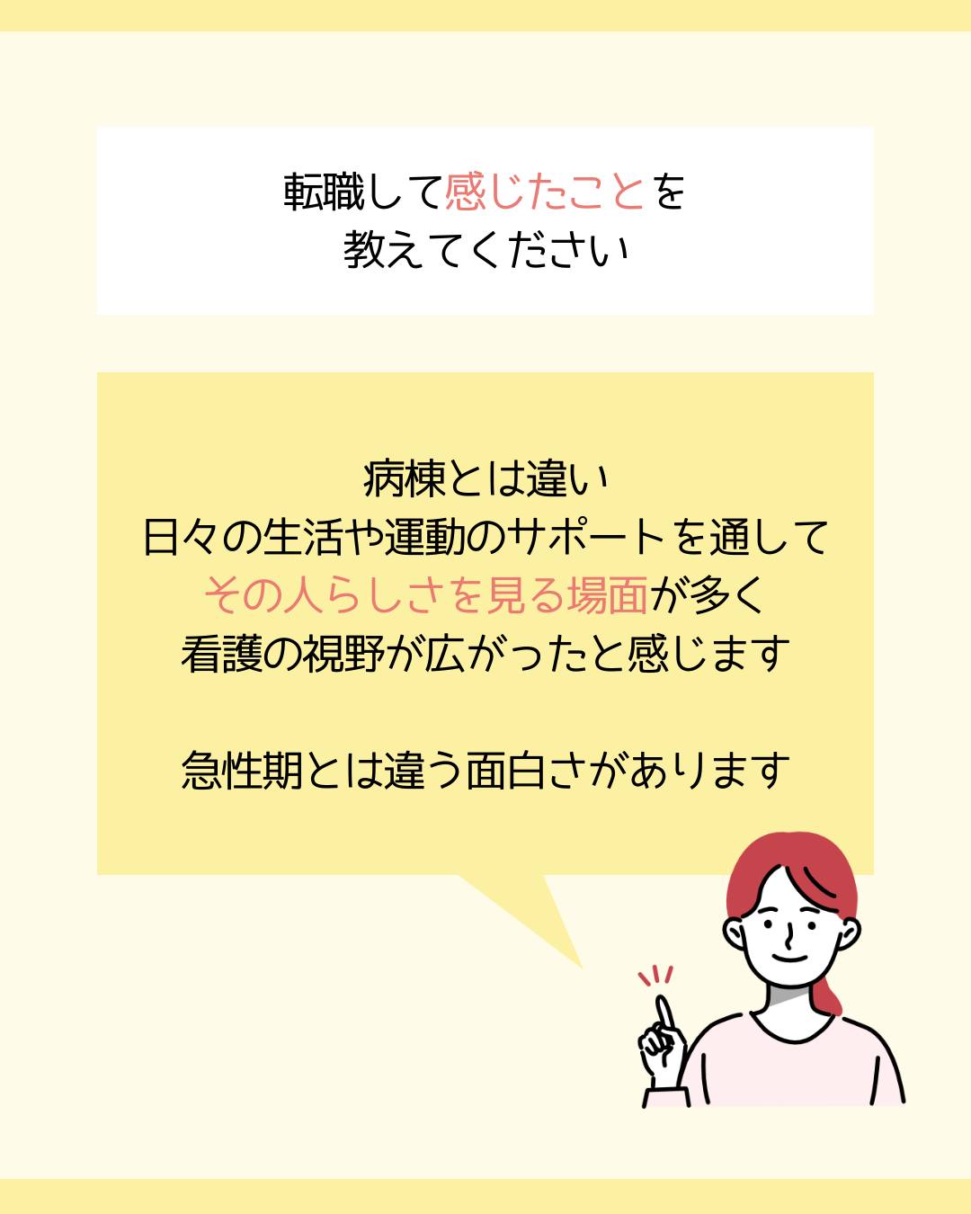 病棟とは違い、日々の生活や運動のサポートを通してその人らしさを見る場面が多く、看護の視野が広がったと感じます。急性期とは違う面白さがあります。