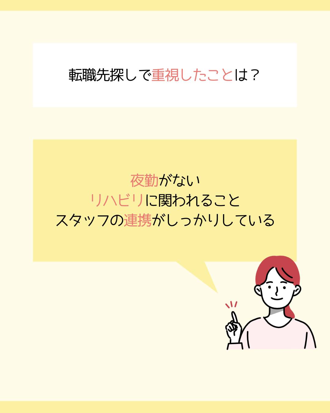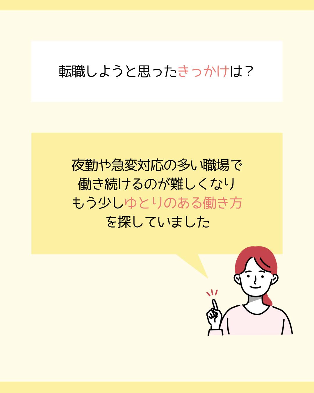 夜勤や急変対応の多い職場で働き続けるのが難しくなり、もう少しゆとりのある働き方を探していました。