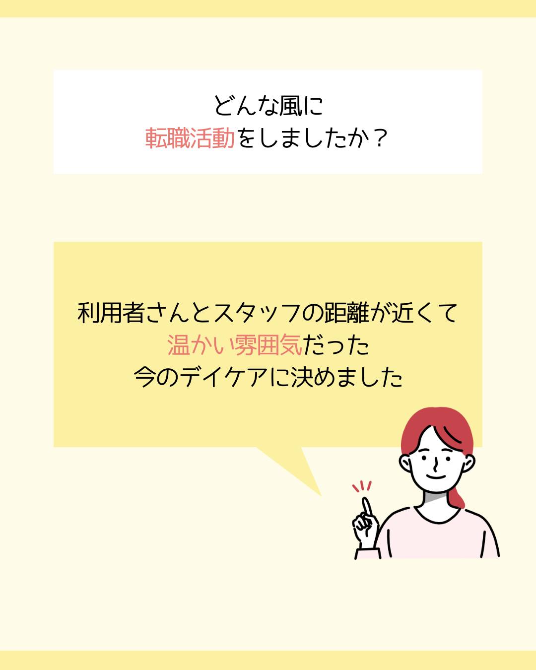 利用者さんとスタッフの距離が近くて温かい雰囲気だった今のデイケアに決めました。