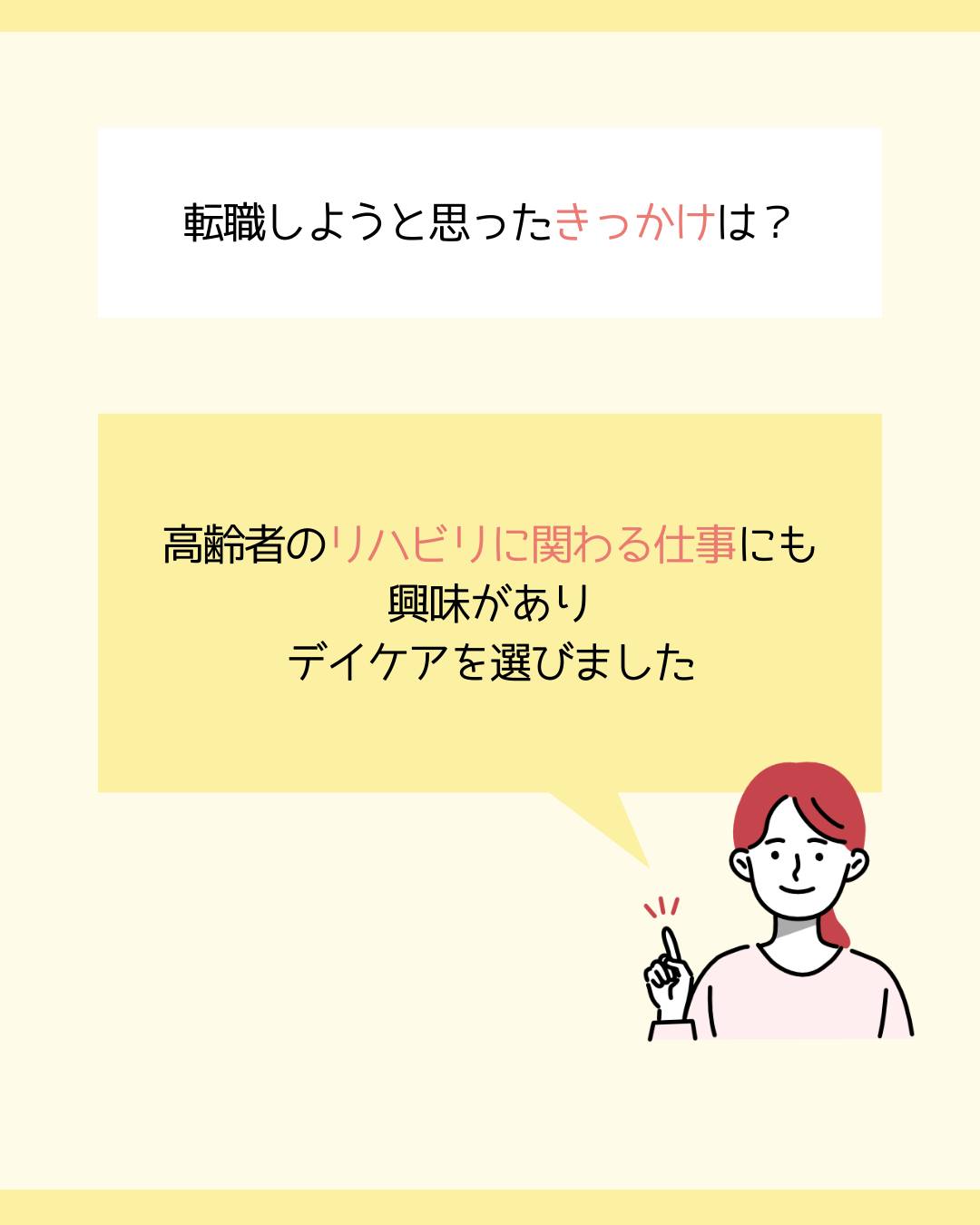 高齢者のリハビリに関わる仕事にも興味があり、デイケアを選びました。
