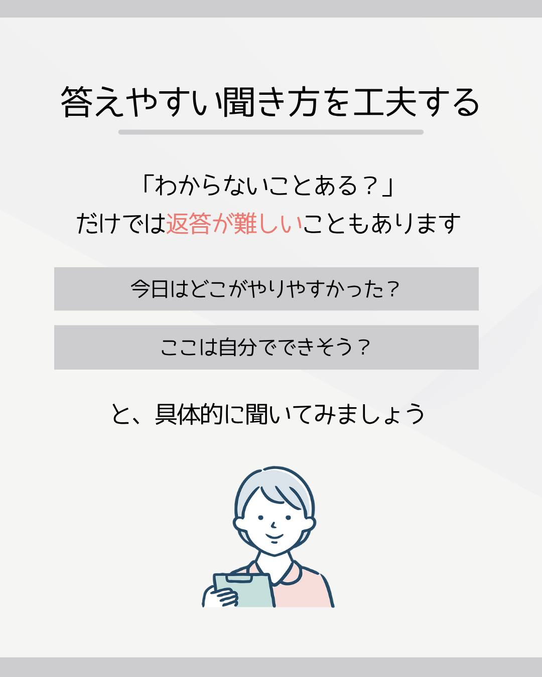 「今日はどこがやりやすかった?」「ここは自分でできそう?」と、具体的に聞いてみましょう。