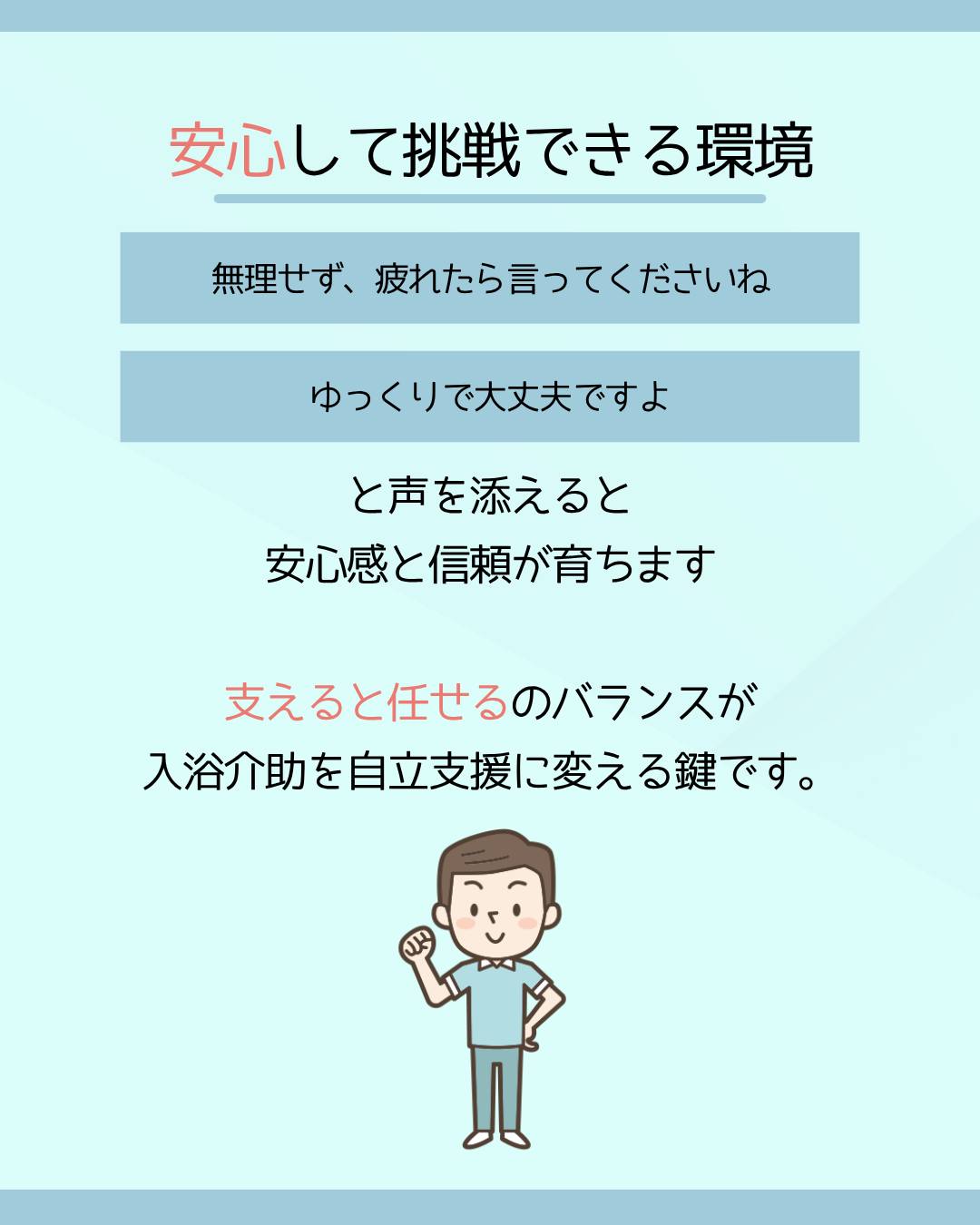 「無理せず、疲れたら言ってくださいね」「ゆっくりで大丈夫ですよ」と声を添えると、安心感と信頼が育ちます。