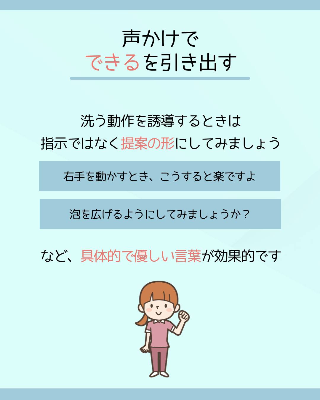 「右手を動かすとき、こうすると楽ですよ」「泡を広げるようにしてみましょうか?」など、具体的で優しい言葉が効果的です。