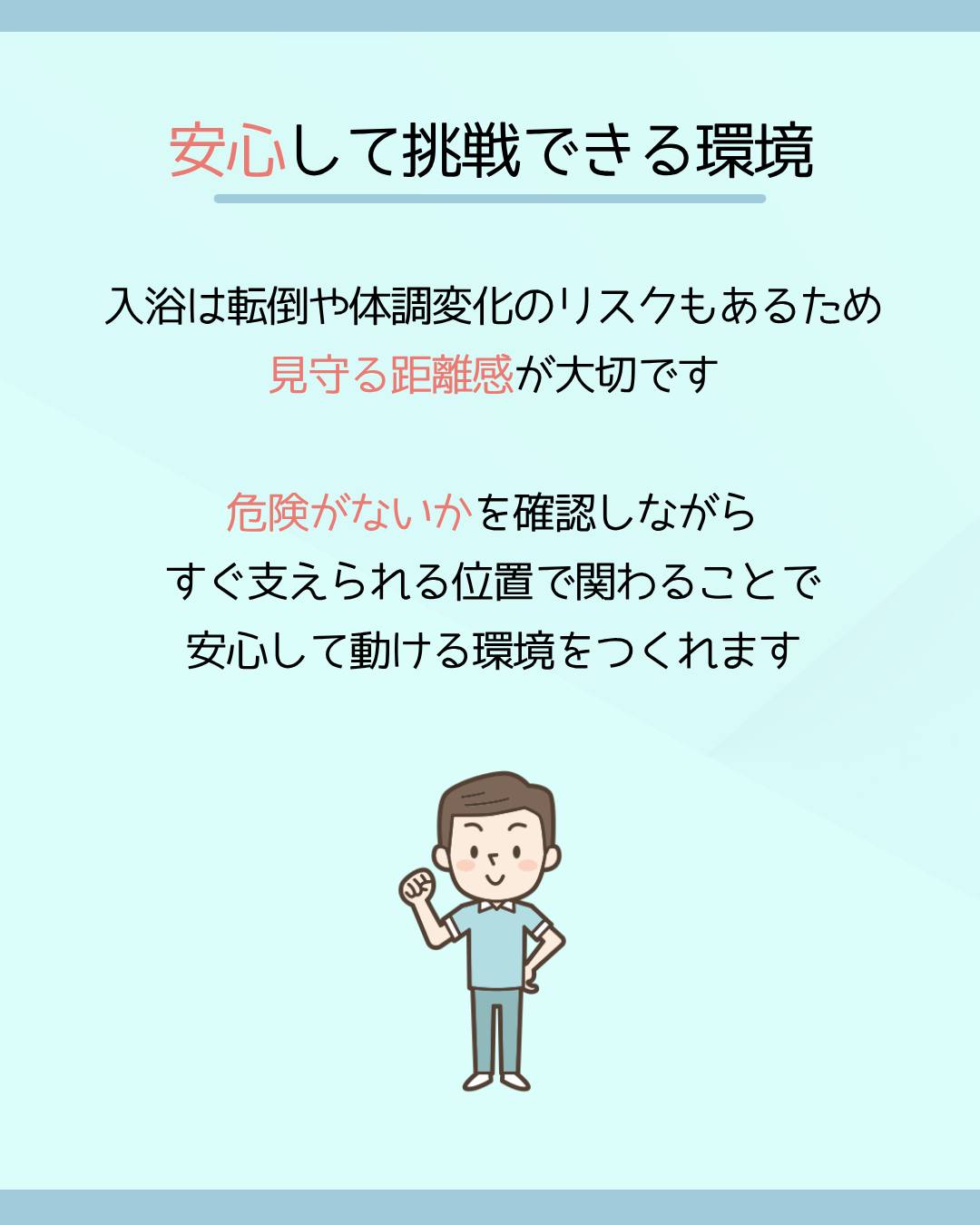 入浴は転倒や体調変化のリスクもあるため、“見守る距離感”が大切です。