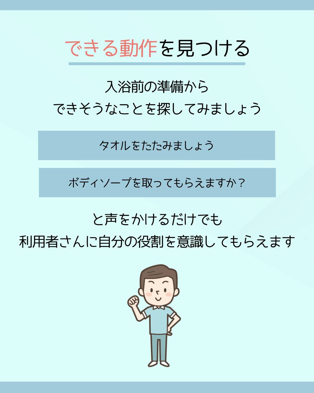 「タオルをたたみましょう」「ボディソープを取ってもらえますか?」と声をかけるだけでも、利用者さんに自分の役割を意識してもらえます。