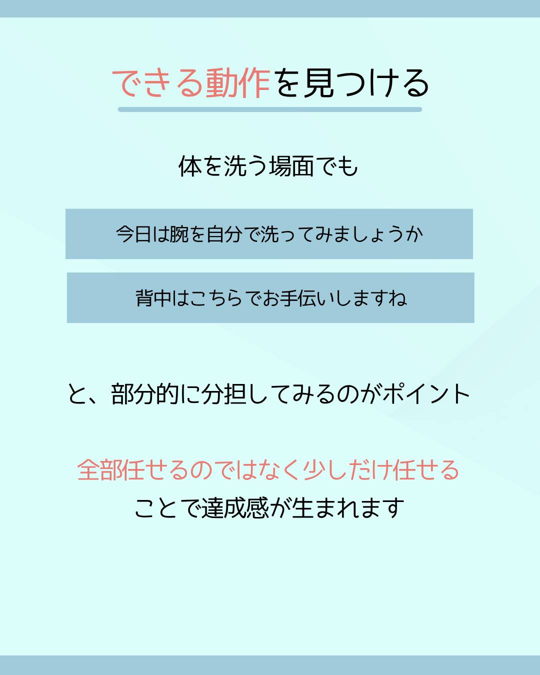 体を洗う場面でも、「今日は腕を自分で洗ってみましょうか」「背中はこちらでお手伝いしますね」と、部分的に分担してみるのがポイント。