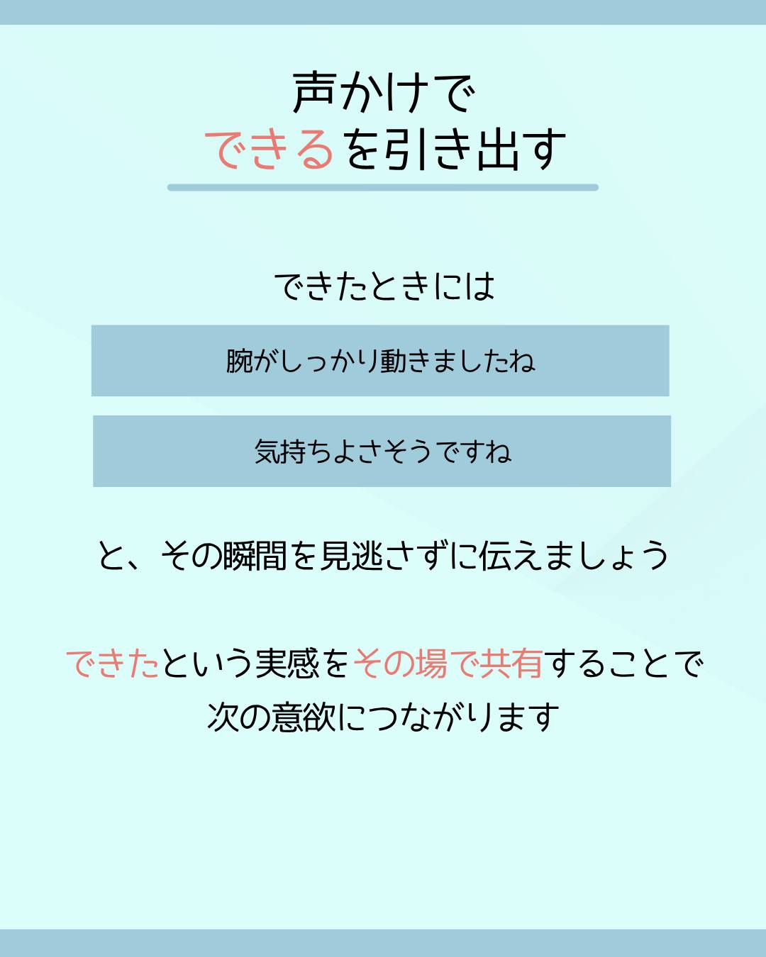 できたときには、「腕がしっかり動きましたね」「気持ちよさそうですね」と、その瞬間を見逃さずに伝えましょう。