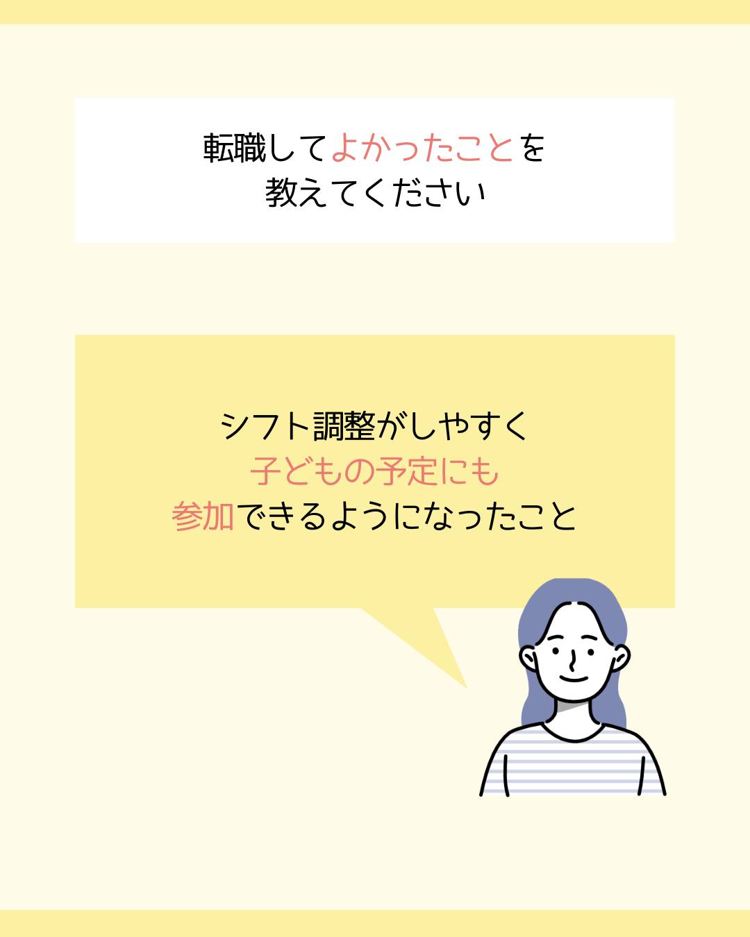 シフト調整がしやすく、子どもの予定にも参加できるようになったこと。