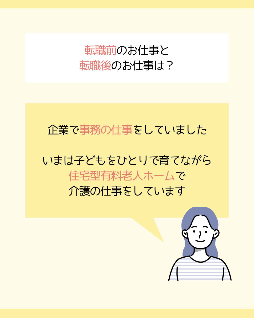 いまは子どもをひとりで育てながら、住宅型有料老人ホームで介護の仕事をしています。