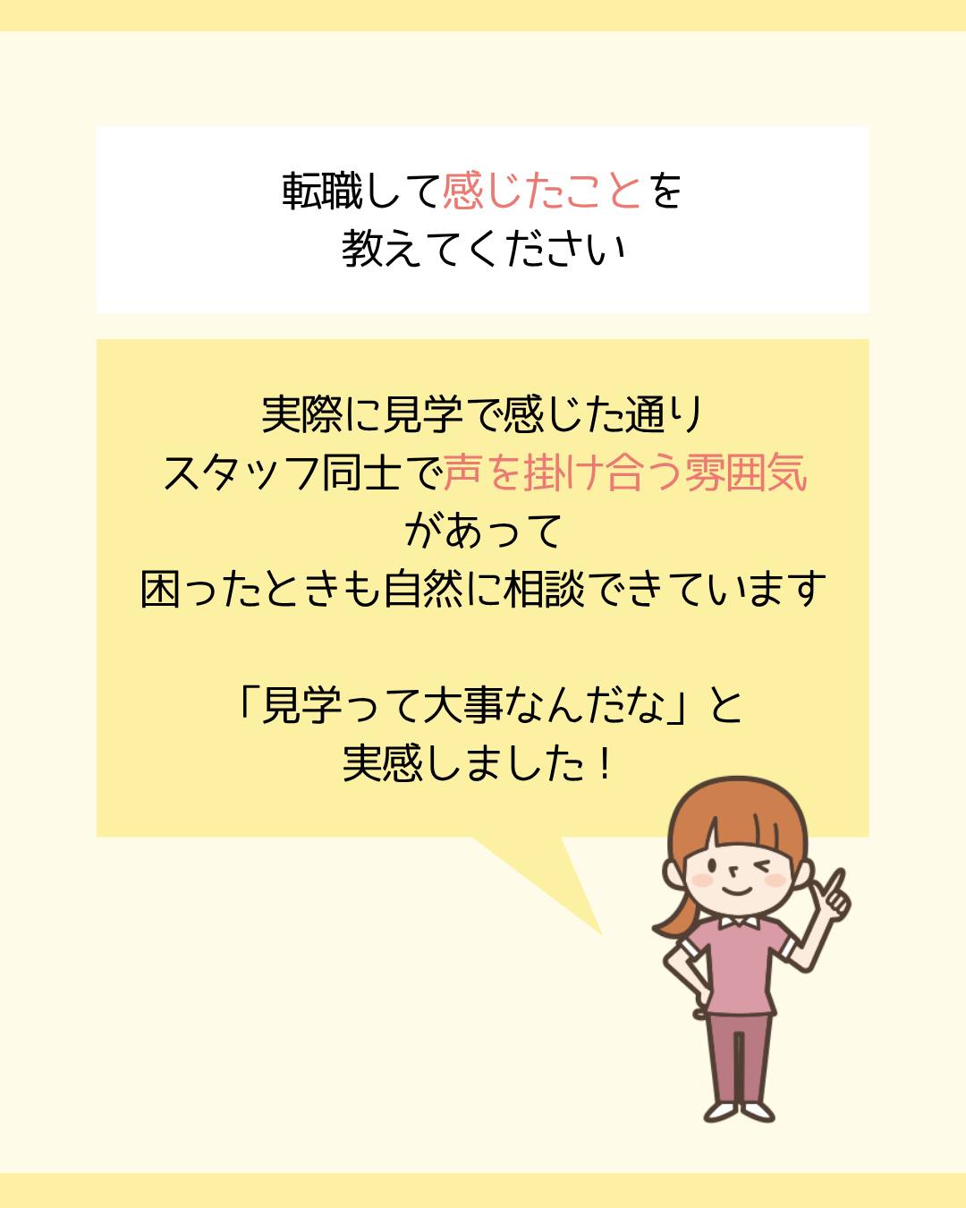 実際に見学で感じた通り、スタッフ同士で声を掛け合う雰囲気があって