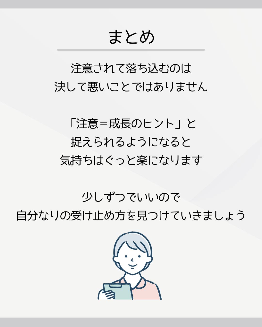 「注意=成長のヒント」と捉えられるようになると、気持ちはぐっと楽になります。