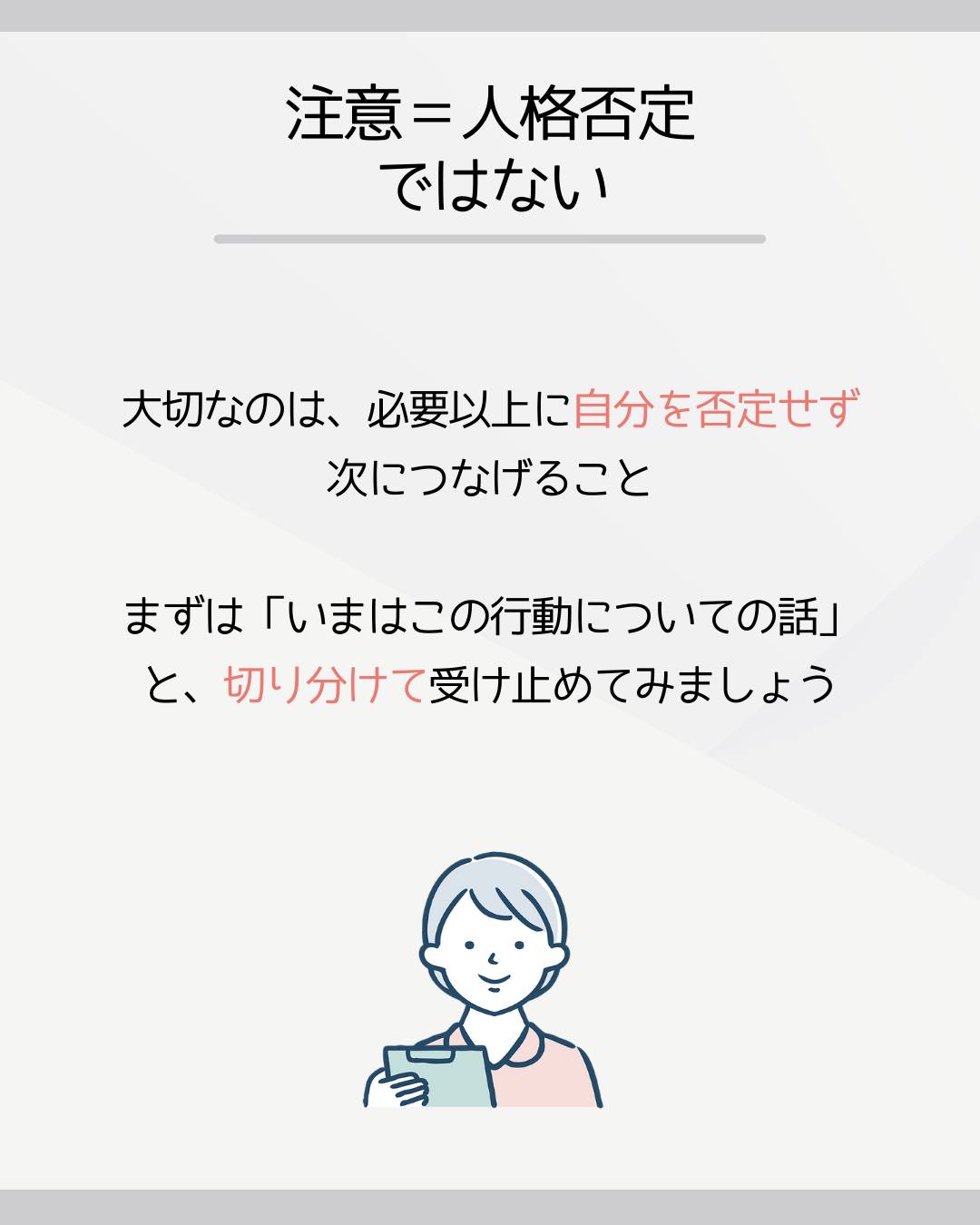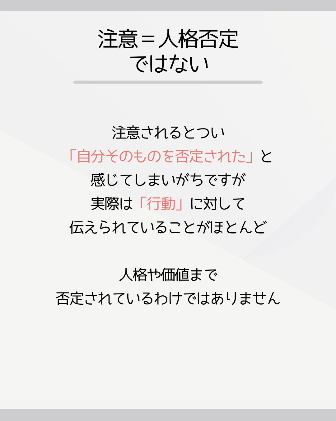 注意されるとつい「自分そのものを否定された」と感じてしまいがちですが、実際は「行動」に対して伝えられていることがほとんど。