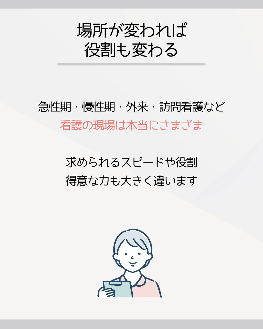 急性期・慢性期・外来・訪問看護など、看護の現場は本当にさまざま。