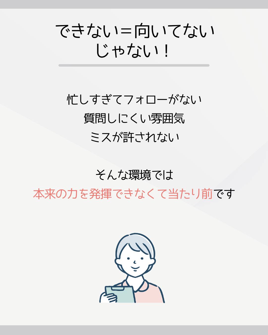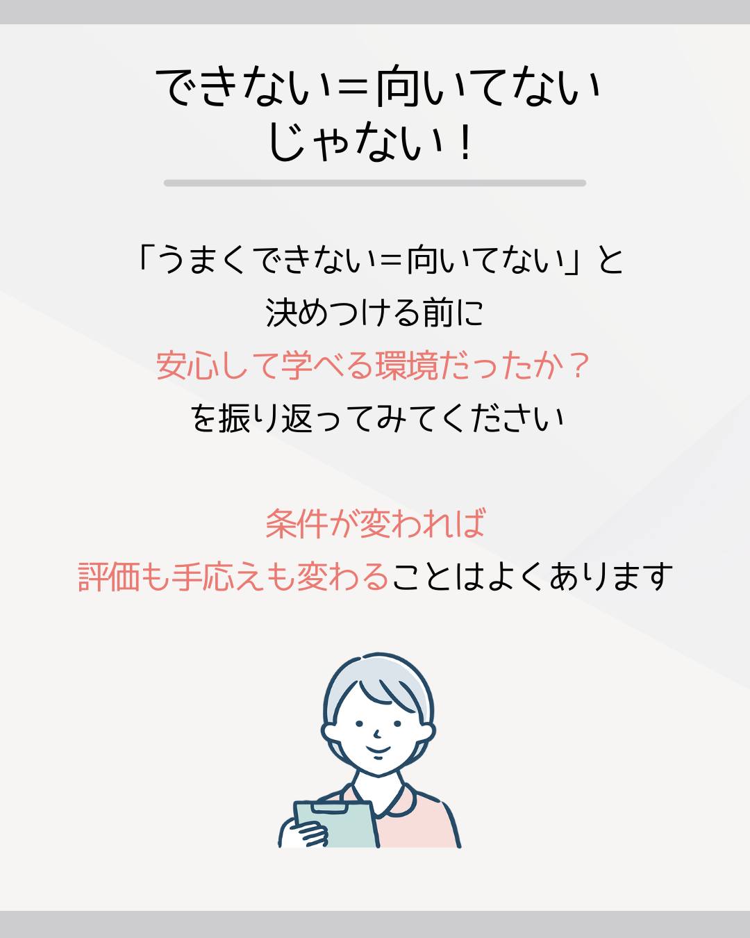 「うまくできない=向いてない」と決めつける前に、安心して学べる環境だったか?を振り返ってみてください。