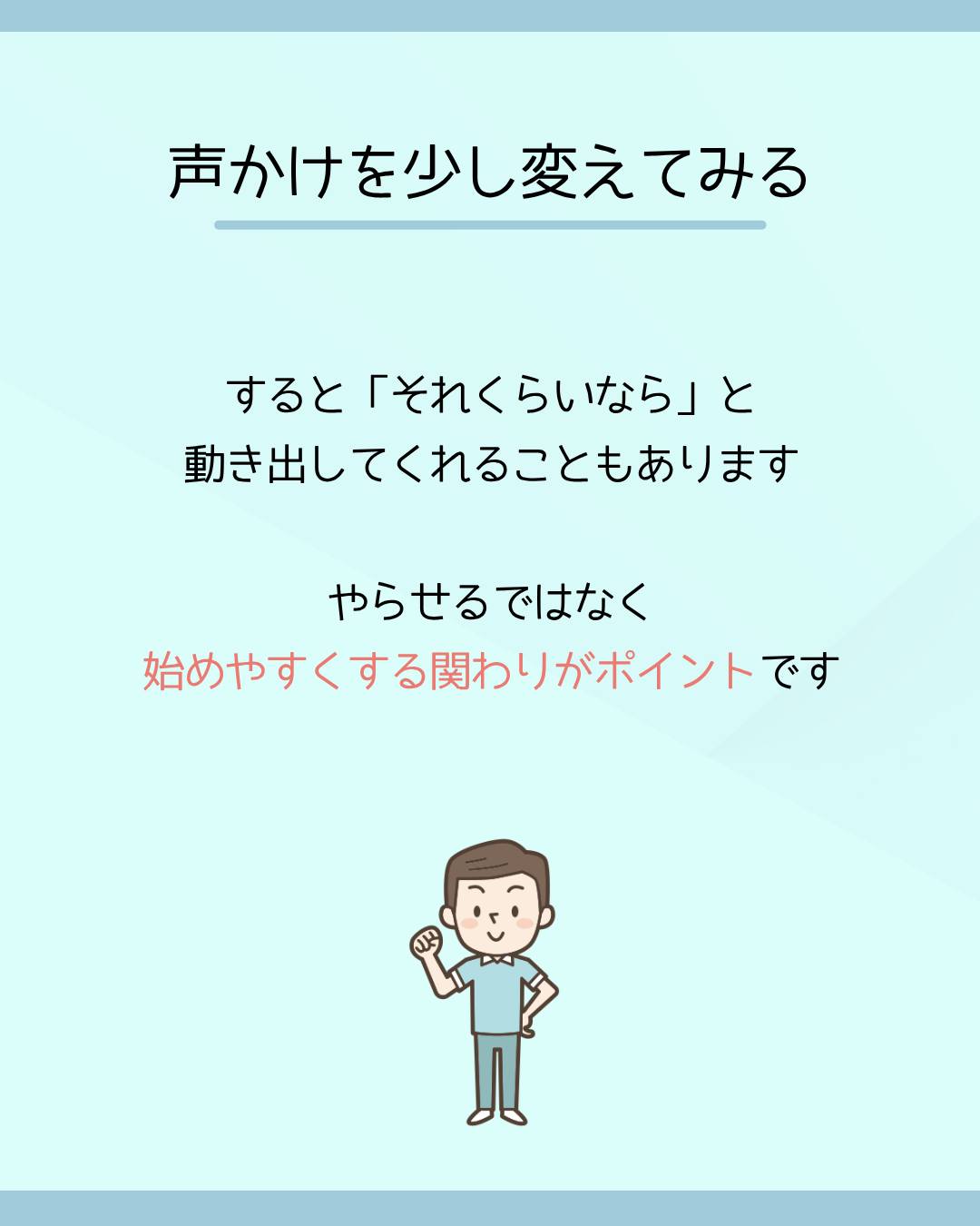 やらせるではなく、始めやすくする関わりがポイントです。