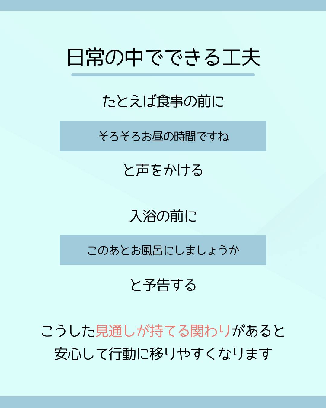 こうした見通しが持てる関わりがあると、安心して行動に移りやすくなります。