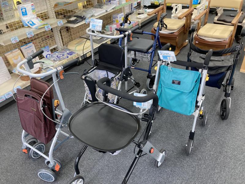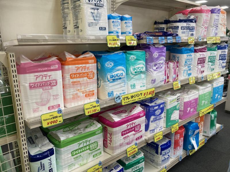 店舗にはベッドや車いすなどの介護保険でレンタルできる商品やおむつや靴などの介護用品も多数店舗に展示しています。